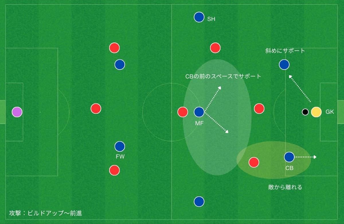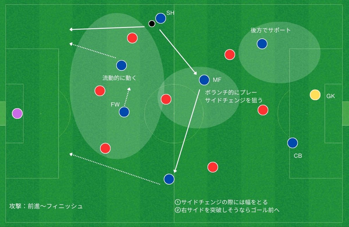 ・MFはSHに対して斜め後ろでサポート(中央からの崩しやサイドチェンジを意識する)